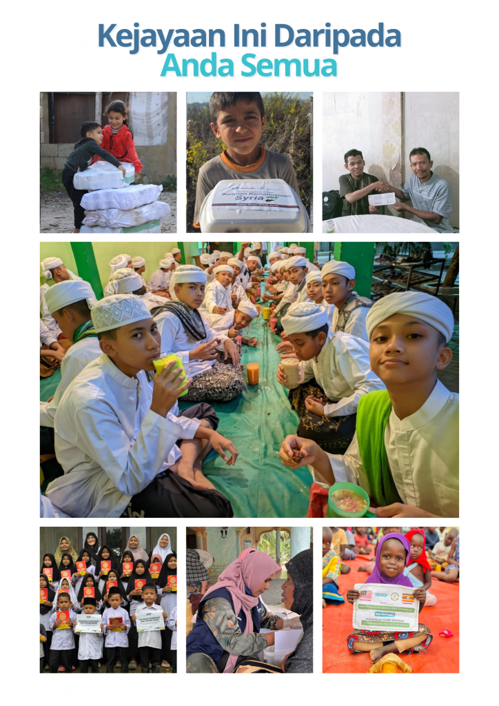 Terima kasih atas kepercayaan serta kebersamaan YBhg Tuan/Puan bersama kami dalam menyebarkan kebaikan. Setiap sokongan, sekecil mana pun, telah menjadi sebahagian daripada rezeki yang Allah SWT titipkan untuk kita salurkan kepada mereka yang memerlukan.